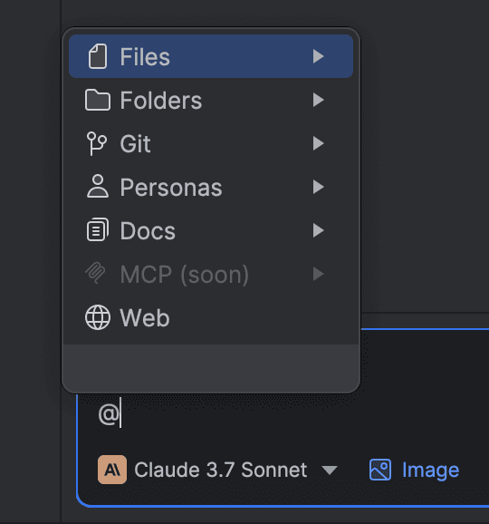 When using the chat input box, you can use @ symbols by typing @. A popup menu will appear with a list of suggestions, and it will automatically filter to only show the most relevant suggestions based on your input.