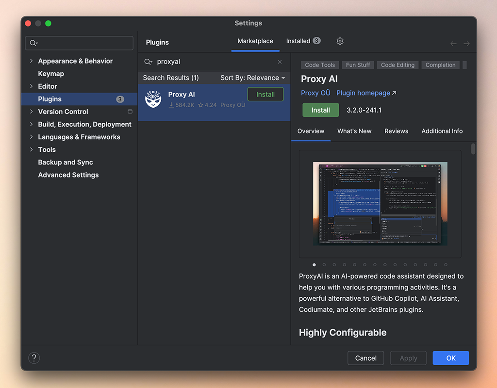 ProxyAIin the Marketplace tab. - Click Install and restart your IDE when prompted.